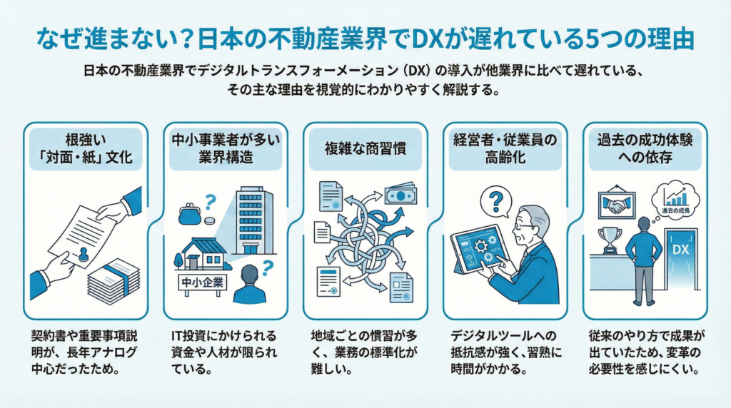 不動産業界でDXが遅れている主な理由として、以下の点が挙げられます。