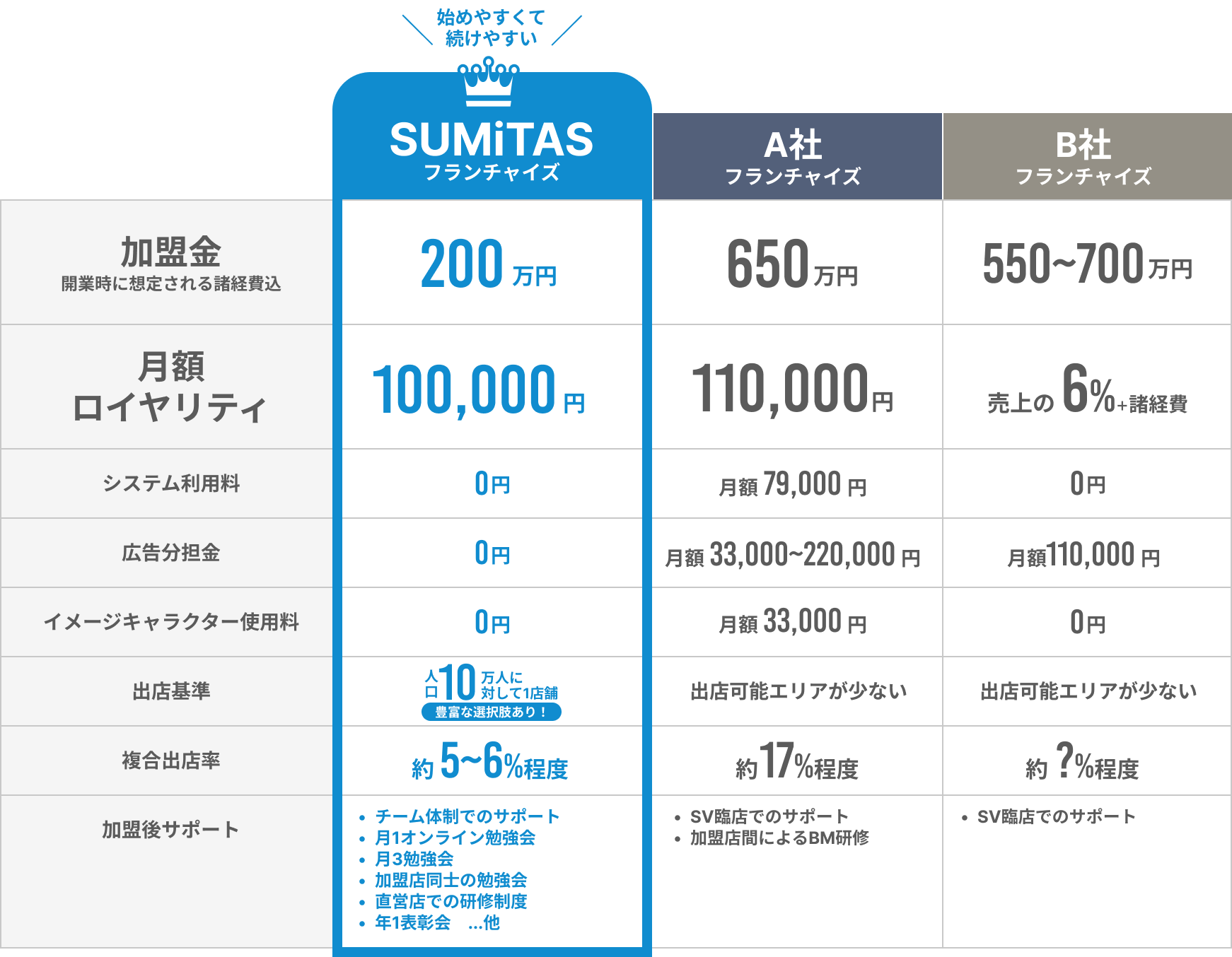 SUMiTASの加盟金は「200万円(税別)」と、業界水準の中でも手が届きやすい設定になっています。